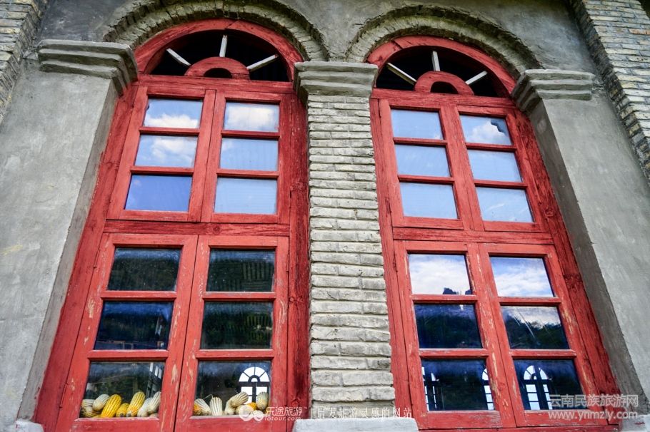 老姆登教堂,怒江流域最大的基督教堂,青磚墻,紅漆木窗,白鐵皮屋頂,簡單樸素,紅色十字架直指天空,“神愛世人”,字體鮮艷。