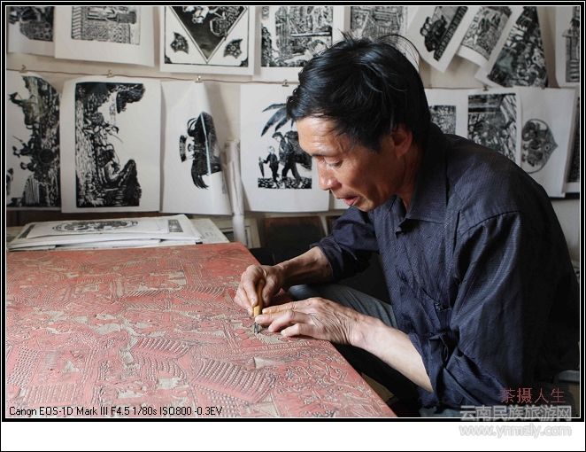 “開始,群眾為避免謄印、剪紙樣、涂顏料的麻煩,干脆把畫畫在木板上,用刀刻好,要繡花時(shí)就用布去木板上印出花樣,這是阿峨新寨最早的版畫。后來,在文化館老師的指導(dǎo)下,他們才在木板上增加了其他內(nèi)容,逐漸演變成了今天的壯鄉(xiāng)民族文化——版畫。”