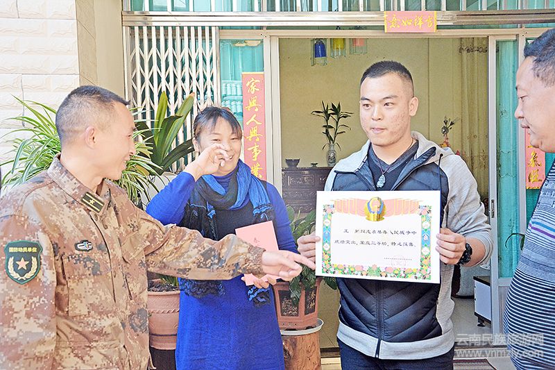 快到退伍戰(zhàn)士王魁家時,鞭炮聲和樂隊聲混雜在一起,猶如一曲交響曲吸引了不少觀眾,群眾得知是報喜也紛紛加入到隊伍中來。王媽媽和王魁聽到門外鑼鼓喧天的聲音立即開門,當?shù)弥獔笙碴犖閬硪夂湍玫较矆髸r,王媽媽控制不住喜悅的心情。抹著熱淚對工作人員說,我兒子能從一個小青年成長為功臣,是部隊培養(yǎng)了他,教育了他,雖然他退伍了,你們還關(guān)心我們,非常非常感謝。王魁于2011年應征入伍,系武警云南省邊防總隊某支隊檢查站原班長,入伍以來,他認真學習政治理論,刻苦訓練,作風嚴謹,工作踏實,認真對過往人員車輛進行嚴密檢查,與戰(zhàn)友密切協(xié)作,多次查獲冰毒、海洛因等毒品,在禁毒人民戰(zhàn)爭中成績突出,被記三等功一次。