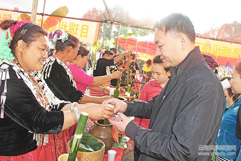 “請嘗嘗我釀制的水酒。”身著民族盛裝的景頗族婦女雙手奉上一杯水酒禮貌地邀請游客品嘗,景頗人的熱情好客感染了大家,無論男女老幼都爭先來喝一口景頗人的美味水酒,氣氛歡樂愉快。