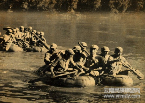 滇西抗戰(zhàn)期間,遠(yuǎn)征軍用橡皮艇進行渡怒江模擬訓(xùn)練。