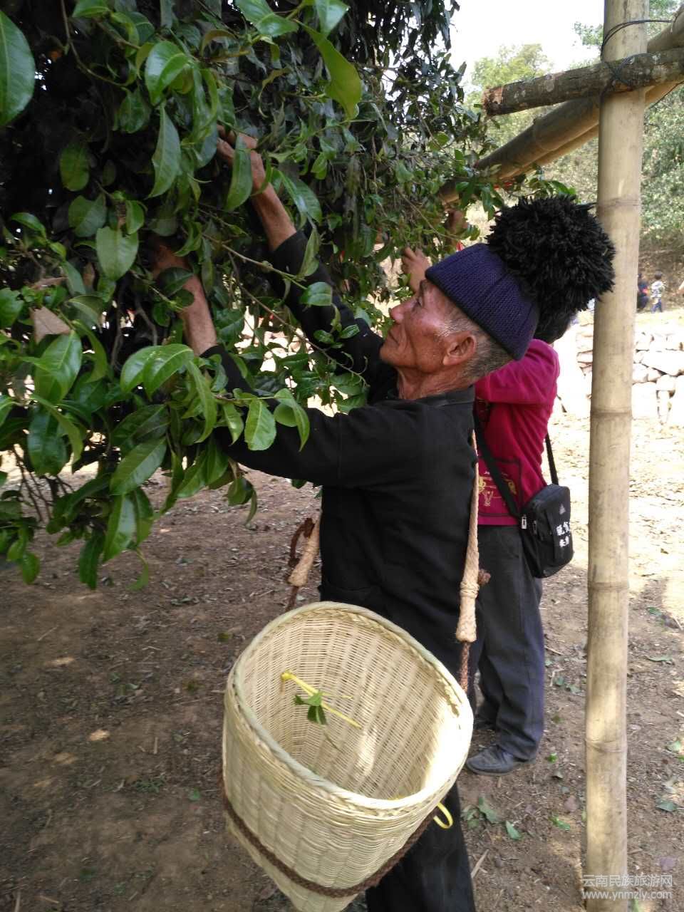隨后,老人們和客人還用竹筒接引山泉,圍著古茶樹澆灌,這個儀式是向茶神獻(xiàn)水,期盼古茶生機勃勃,滋潤后人。在悠揚的佤族樂曲聲中,采茶妹和采茶哥攀上高高的架子,在外圍采摘茶后的第一抹新綠,很多客人也興致勃勃地加入了采茶行列。