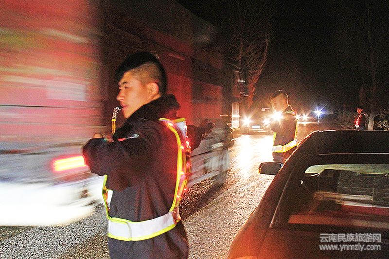 每當夜幕降臨,無論從曲靖城水寨方向進入326國道線,還是從石寶山方向沿326國道線進城,都能看到狹窄的道路兩旁每隔一段距離就會有一到兩個閃著紅色的暖暖光芒的“星星”,打著手勢,吹著哨子指引著過往車輛的通行。