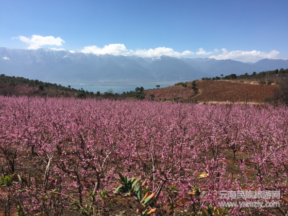 登上文筆大坪地,桃站在花林旁,可以俯覽整個(gè)蒼洱大地,“三島”、“四洲”、“五湖”、“九曲”凈收眼底。更能清晰地看到“佛都”——崇圣寺三塔。正所謂“遠(yuǎn)眺崇圣三塔,近賞文筆桃花”。