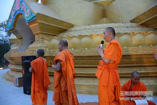 在莊嚴(yán)肅穆的誦經(jīng)聲中,高僧們合掌圍著金塔走過。虔誠的群眾在高僧走過時,用手里纖細(xì)的蠟燭點(diǎn)燃了擺在臺階上的燈盞。高僧們過后,一盞盞祈福燈亮起來,一圈圈、一層層的燈光像漣漪般蕩漾在金塔周圍。