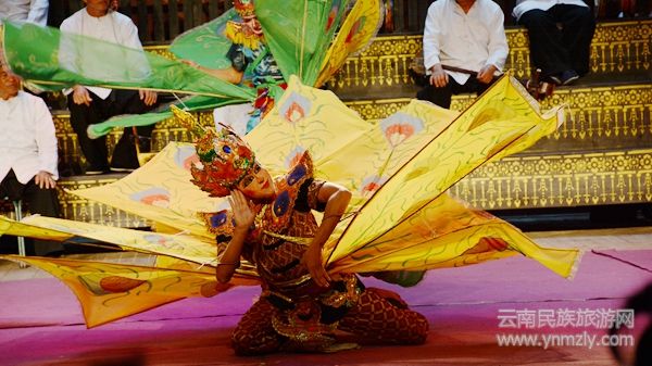 “《嘎婻啰》是傣語,即孔雀羽毛舞的意思。古時候,只有在傣王的王宮里才可以看到這種表演。舞者為身材較瘦的男子,手持孔雀羽毛,時蹲時跪,舞動孔雀羽毛表演,是典型的傣族宮廷舞……”隨著主持的講解聲,一隊(duì)男子畫著臉、戴著面具,在舞臺上瀟灑地做著各種動作。