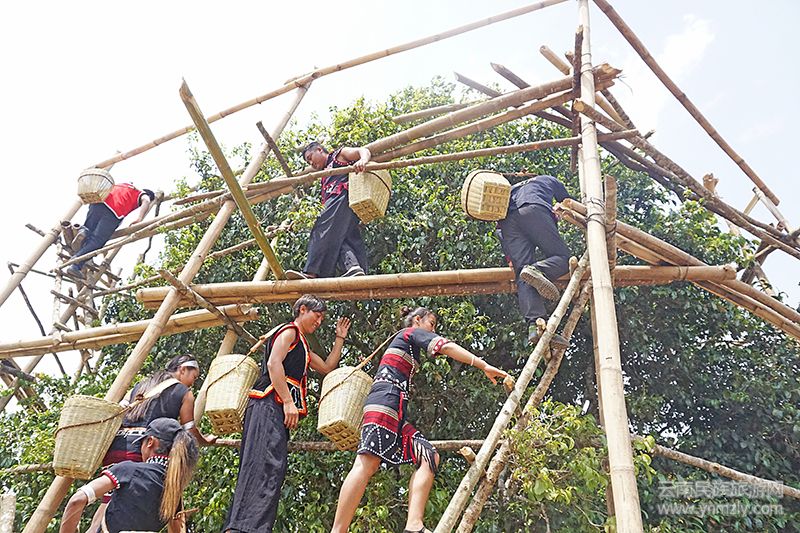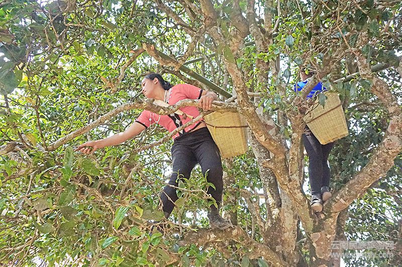 隨后,老人們和客人還用竹筒接引山泉,圍著古茶樹澆灌,這個(gè)儀式是向茶神獻(xiàn)水,期盼古茶生機(jī)勃勃,滋潤后人。在悠揚(yáng)的佤族樂曲聲中,采茶妹和采茶哥攀上高高的架子,在外圍采摘茶后的第一抹新綠,很多客人也興致勃勃地加入了采茶行列。