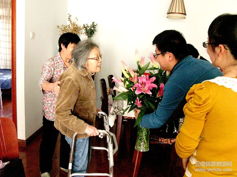 收藏者家人向劉自鳴先生獻(xiàn)上鮮花百合時(shí),先生笑了,說:“謝謝!”