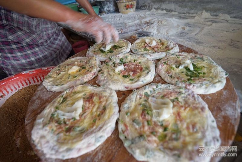 喜洲粑粑有甜和咸兩種,分別加上了肉末和白糖。