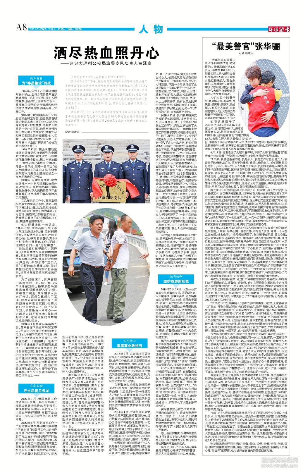 民警徐航說:我們最佩服黃支隊長的是他的堅強,處事有擔(dān)當(dāng)。2015年11月初,他兒子大學(xué)畢業(yè)剛參加工作不久,突然生病住進了大理醫(yī)學(xué)院附屬醫(yī)院。一直默默支持他工作的妻子突然打電話給他說兒子住院了,要他下來看一下,找個好點的醫(yī)生。他反而安慰妻子說,兒子身體好,不會生什么大病,有他們照顧就好,現(xiàn)在工作比較忙,等有時間他會下來的。朋友同事到醫(yī)院看望,他還說麻煩大家了。當(dāng)時支隊正在考核,又在組織新警培訓(xùn),還在搞年終工作總結(jié),特別是正在辦理著幾個大案件,幾天幾夜都赴在案子上,直到醫(yī)院下發(fā)了兒子病危通知,他才知道兒子病很嚴(yán)重了,在領(lǐng)導(dǎo)和同志們的督促下,他才到醫(yī)院看兒子,通過和主治醫(yī)生緊急商量,決定轉(zhuǎn)往昆明昆華醫(yī)院治療,他跟領(lǐng)導(dǎo)請假,又到支隊安排好工作,才送兒子到昆明昆華醫(yī)院。在兒子在昆華醫(yī)院治療期間,他身在昆明心在大理,一方面安慰妻子鼓勵兒子和醫(yī)生溝通治療方法,一方面指揮下面的民警干好工作。在他的指揮下,培訓(xùn)圓滿完成,考核取得了好成績,案子也在依法辦理中,2015年12月15日,有同事到昆明拉警務(wù)裝備,他還說兒子的病好多了,一時半會還出不了院,不能在擔(dān)誤工作了,要回來支隊抓工作,叫同事順路走時接他一起回下關(guān),下午5點多他兒子突然病情加重,晚上7點多鐘經(jīng)搶救無效死亡。