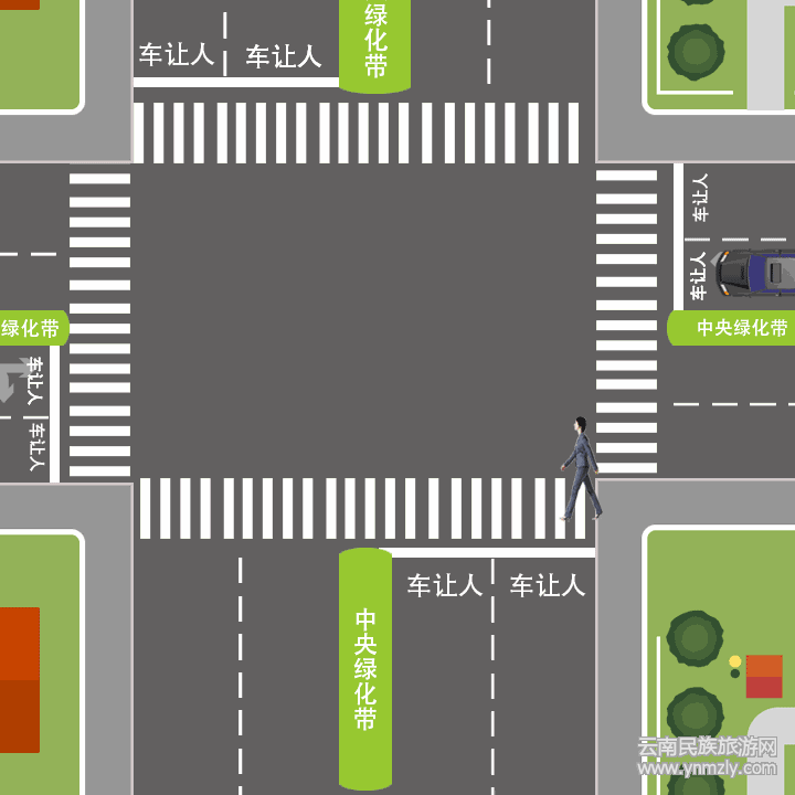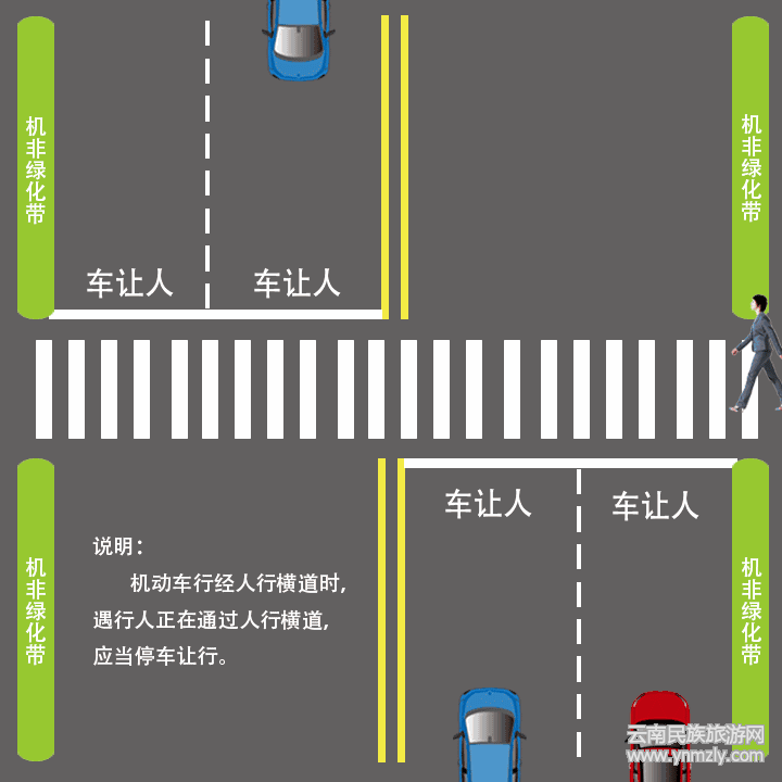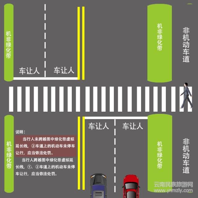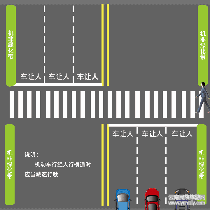 當(dāng)車輛行經(jīng)人行橫道,行人步入斑馬線時(shí),最靠近行人車道內(nèi)的車輛必須禮讓行人;行人開始通過斑馬線,所在車道車輛和下一車道車輛必須讓行;行人到達(dá)中央綠化隔離帶或雙黃線,下一車道車輛必須讓行。