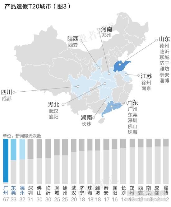 具體到各造假城市,廣州以67條造假新聞數(shù)量成為全國(guó)榜首,前20個(gè)造假城市中,山東占7席,廣東占5席。(如圖3)