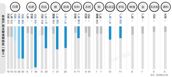 數(shù)據(jù)顯示,14類主要造假產(chǎn)品類型的生產(chǎn)地大多來(lái)自——廣東(11次)和山東(5次),此外還有河南(4次)、福建(2次)。(如圖5)