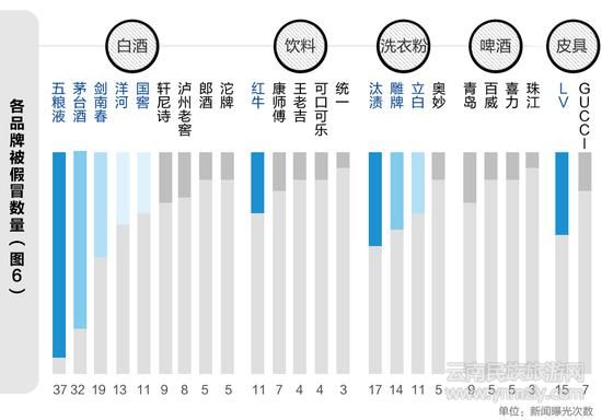 功能飲料“紅牛”也多次被爆出造假,其中僅廣東佛山市就被查獲3次。汰漬、立白、雕牌洗衣粉在多省均有被造假。LV成皮具被仿冒的寵兒,造假地主要集中在廣東。太太樂(lè)雞精被假冒提及次數(shù)達(dá)到9次。手機(jī)品牌則主要為蘋(píng)果、三星。耐克、阿迪達(dá)斯為主要鞋造假牌子。(如圖6)