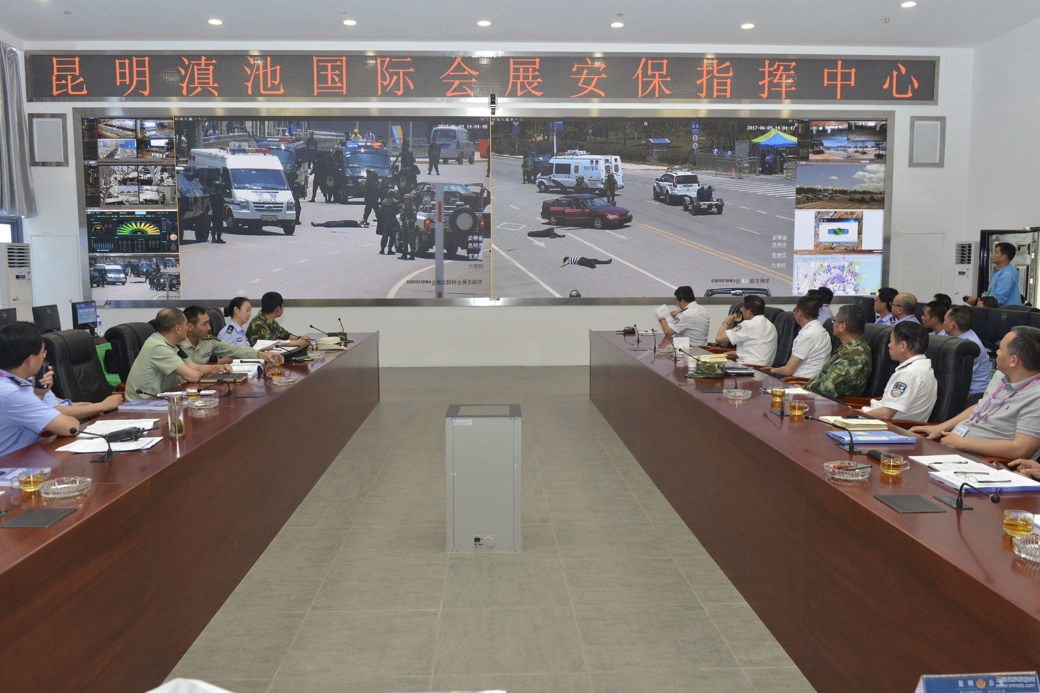 6月9日,2017年南亞東南亞國家商品展暨投資貿(mào)易洽談會召開前夕,昆明市公安局舉行現(xiàn)場安保實兵演練,省公安廳黨委書記、廳長任軍號出席演練活動并提出要求,對堅守崗位的執(zhí)勤民警表示慰問。省公安廳黨委副書記、常務副廳長董家祿,省公安廳黨委委員、副廳長胡祖俊,省公安廳黨委委員、昆明市副市長、市公安局局長刀勇,省公安廳黨委委員、副廳長尹建江出席演練活動。