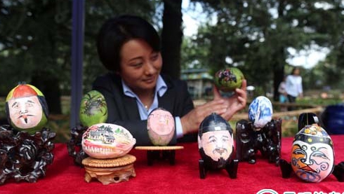 開幕當天,一個個繪有精美圖案的木瓜最為吸睛,它們都出自尋甸縣文化館的4位民間畫家之手。嬌俏可愛的白族姑娘、在屋頂上慵懶曬太陽的黑貓、凌寒獨自開的梅花、青花瓷質感的山水畫……不論是風景、植物、動物,還是民間生活場景,都栩栩如生地展現(xiàn)在一個個拳頭大小的青色木瓜上。