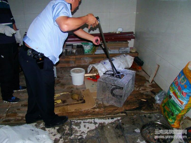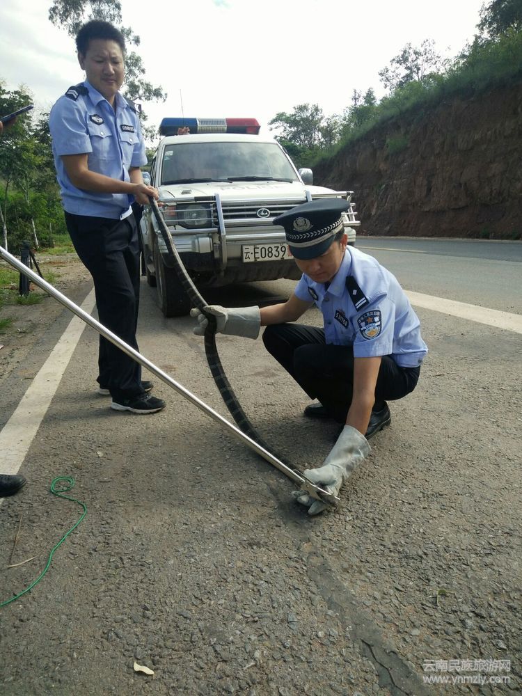 接警后永仁縣森林公安局局長(zhǎng)劉喜立即帶領(lǐng)有豐富捕蛇經(jīng)驗(yàn)的民警帶上捕蛇工具前往現(xiàn)場(chǎng)處置。到達(dá)現(xiàn)場(chǎng)后,經(jīng)過(guò)二十分鐘的搜尋,終于在一個(gè)雜物間的角落里看見(jiàn)一條約有茶杯粗,昂著頭吐著信子的眼鏡蛇,見(jiàn)狀民警用蛇夾小心將其夾住放入蛇籠當(dāng)中,安全隱患解除,報(bào)警人連聲說(shuō)謝謝,感謝森林公安為他家消除危險(xiǎn),并打趣的說(shuō):“今天是彝族人民‘火把節(jié)’開(kāi)始的第一天,我們?nèi)疑舷露即┦⒀b,唱酒歌,祈福祝愿來(lái)年日子越來(lái)越紅火,這么大的眼鏡蛇也來(lái)我家湊熱鬧,看來(lái)來(lái)年要發(fā)財(cái)了。”