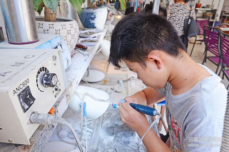 今年26歲的景頗族小伙子來(lái)馬南是德宏芒市人,這個(gè)左腿殘疾的年輕人在玉雕工作室學(xué)習(xí)玉雕已經(jīng)四年了。現(xiàn)如今,來(lái)馬南以嫻熟的玉雕技術(shù)已成為玉雕工作室里小有成就小師傅,平日里師傅方卡華出門談生意不在工作室的時(shí)候,都是他在耐心地教其他幾位小師弟們雕刻。“來(lái)我們這里學(xué)習(xí)玉雕的大多數(shù)都是殘疾人,方師傅對(duì)每一位學(xué)員都很細(xì)心,他不止耐心的教大家怎么雕刻,還每個(gè)月給大家一些生活費(fèi)、零花錢。在這里,我們就像在一個(gè)大家庭里,安心的學(xué)習(xí)、快樂(lè)的生活。雖然大家都說(shuō)我是這里學(xué)得最好的徒弟,但我還是想多跟著方師傅學(xué)習(xí)幾年,把玉雕技藝在提升一些。”靦腆不多話的來(lái)馬南說(shuō)起幾年來(lái)在工作室的點(diǎn)滴生活,臉上微微露出了笑容。