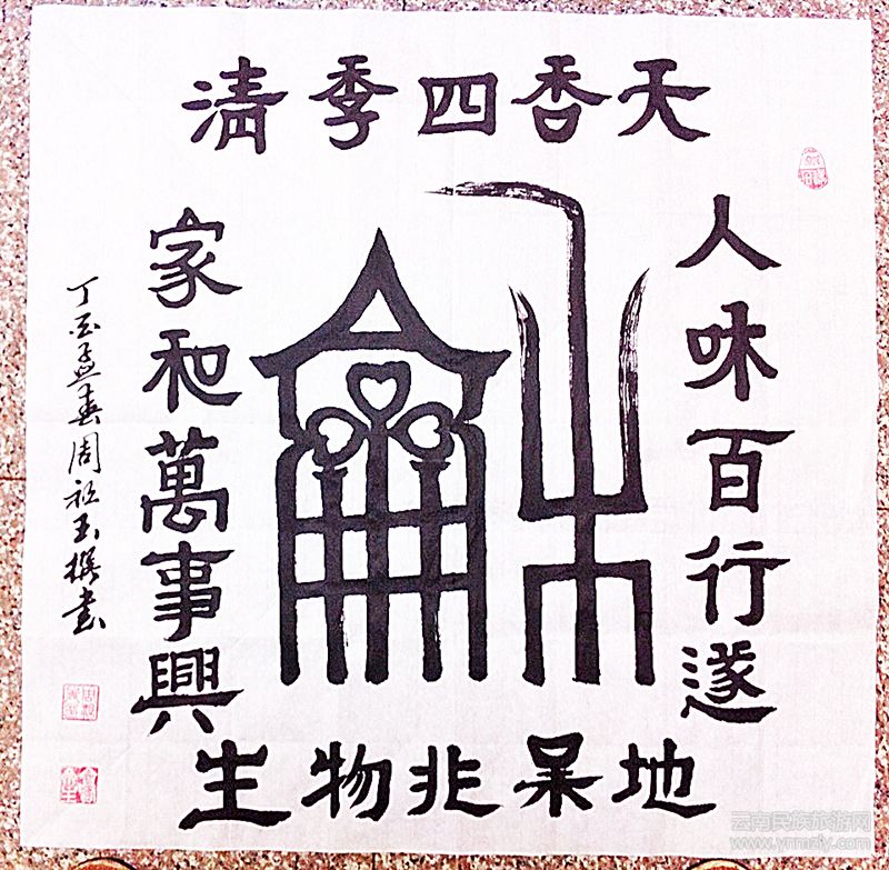 周祖玉說(shuō):“我觸及書(shū)法與家嚴(yán)的職業(yè)不無(wú)關(guān)系。兒時(shí),我曾記得,在我家的堂屋正中張賬著用四尺半開(kāi)紅紙書(shū)寫(xiě)的‘天地國(guó)親師位’,兩邊分別貼著‘祖宗格言克勤克儉;子孫正路惟讀惟耕’的對(duì)聯(lián)。中堂之字端莊丶規(guī)整丶有骨丶有肉,嚴(yán)然不乏顏體風(fēng)格;對(duì)聯(lián)則淸秀丶雋永丶無(wú)媚丶無(wú)俗,依稀閃現(xiàn)黃楷影子。但凡文人雅士見(jiàn)到,總少不了贊賞幾句。家嚴(yán)也說(shuō):‘字是敲門錘’。一篇文章,如果字寫(xiě)得好,先生或領(lǐng)導(dǎo)都不會(huì)隨便對(duì)待。”至此,周祖玉對(duì)漢字書(shū)寫(xiě)便不敢馬虎了。