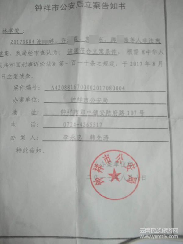 鐘祥市公安局立案告知書(shū)