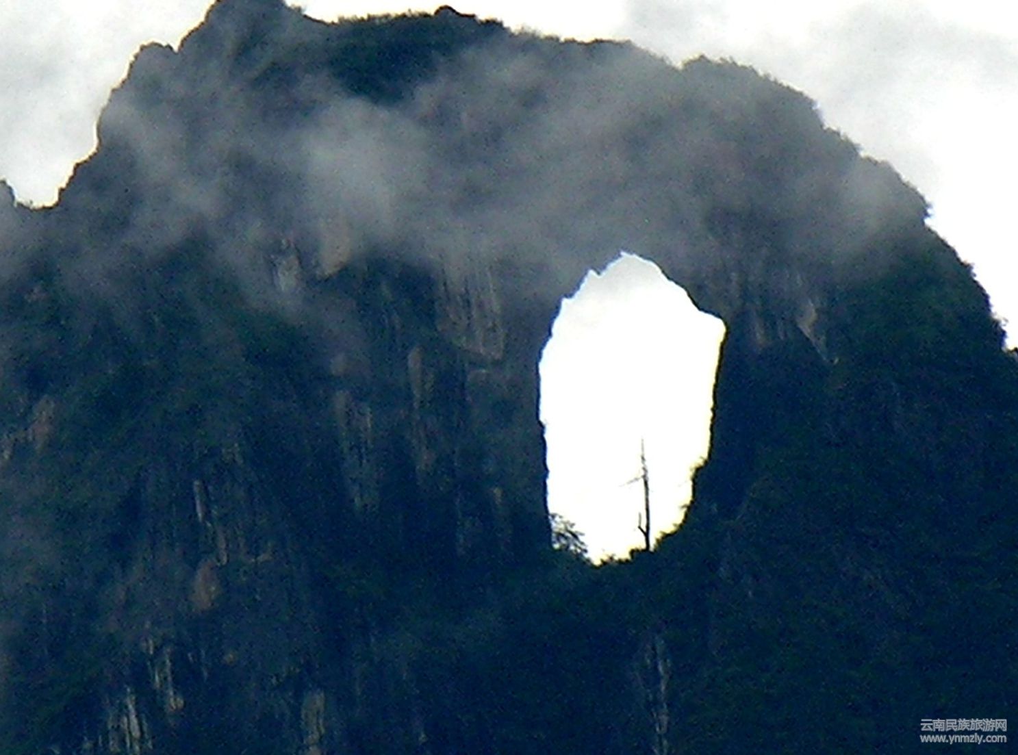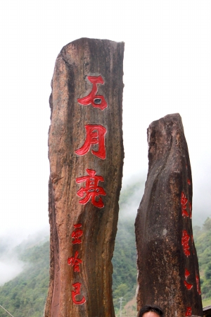 石月亮四周的懸崖峭壁,深不可測。前面有三棵年代極古的枯樹,云霧升騰,飄渺不定,大有身在天上宮闕之感,山風(fēng)獵獵,令人眩暈。