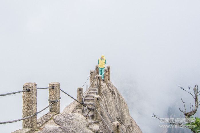登天都峰的階梯有著超大的傾角,時常讓人手腳并用,鑿出來的石階還沒有我41碼的腳寬,幾乎所有登山的人都在邊爬邊罵!這可能就是登山的樂趣所在吧?大家心里都明白,越難爬,到達(dá)頂峰就會越自豪。爬完石階,穿過鯽魚背就算登頂了。可不要小瞧了這鯽魚背!此石矼長10余米,寬僅1米,兩側(cè)懸崖深不可測,其形頗似出沒于波濤之中的鯽魚之背,故名鯽魚背。自上而下,坡陡達(dá)85度左右,若遇風(fēng)吹云涌,仿佛山搖石動,這里站上一站可比網(wǎng)紅玻璃棧道刺激多了!反正我的腿是抖的。然而,路遇撿垃圾的大叔卻可以兩手背后,閑庭信步,在我心中真是神仙一般的存在!