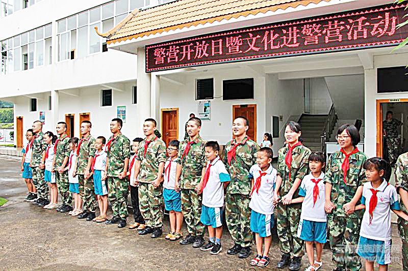 在駐地操場上學(xué)生為心中的英雄叔叔佩戴紅領(lǐng)巾,互相敬禮致敬,手牽手共唱《我愛北京天安門》。稚嫩的小手被武警叔叔溫暖的大手牽著,嘹亮的合唱聲響徹云霄,一幅溫馨的畫面。