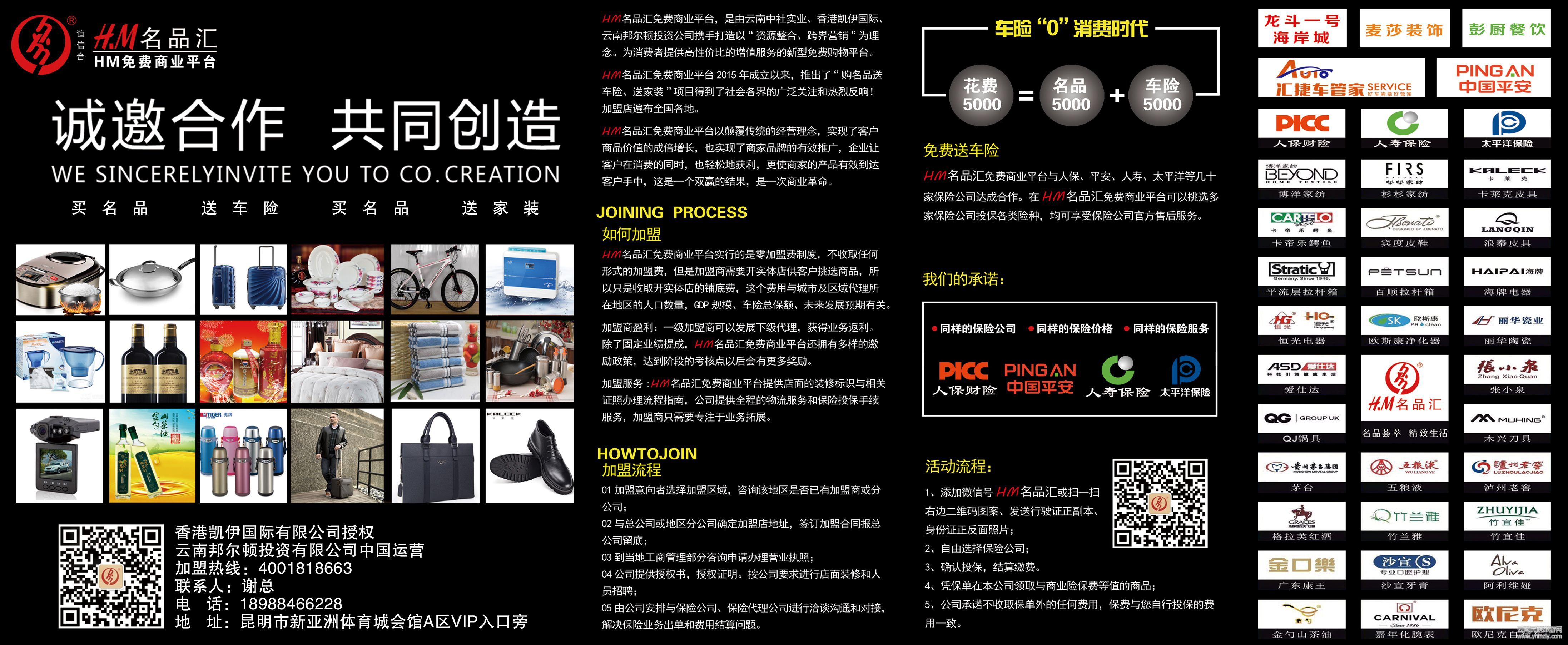 “H.M名品匯公司引入跨界營銷新思維,與國內(nèi)各大保險公司強強聯(lián)合,創(chuàng)新推出買商品送車險全新營銷模式,經(jīng)營者實現(xiàn)雙重盈利,消費者實現(xiàn)買車險不花錢。”云南邦爾頓投資公司總經(jīng)理謝賢說。