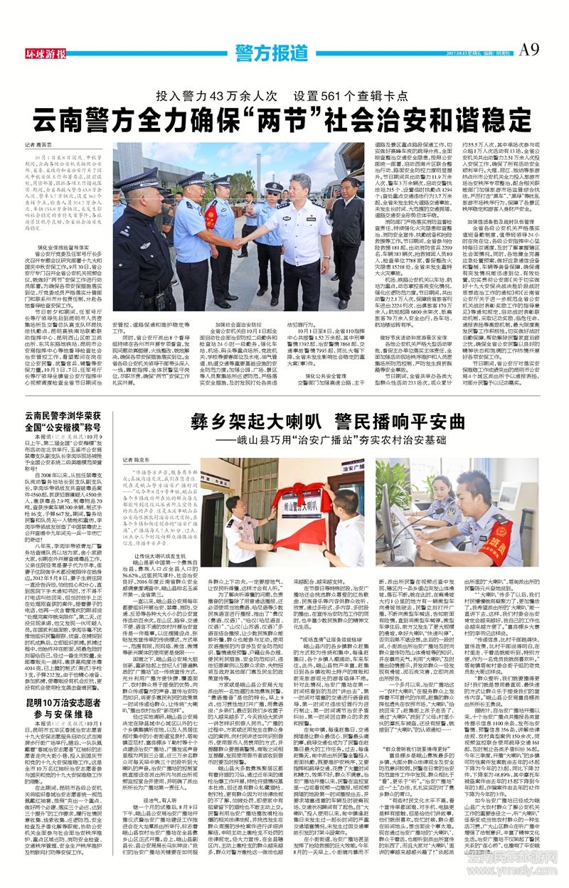 10月1日至8日國慶、中秋節(jié)期間,云南各級公安機(jī)關(guān)按照公安部、省委、省政府和省公安廳關(guān)于國慶中秋安保工作部署要求,提前謀劃,周密部署,狠抓各項(xiàng)工作措施落實(shí)。期間,全省共投入警力43.8萬余人次、警車5.7萬輛次,設(shè)置561個查輯卡點(diǎn),檢查人員314.7萬余人次、車輛155.8萬余輛次,未發(fā)生影響社會穩(wěn)定的重特大案事件,各旅游景區(qū)秩序良好,全省社會治安大局穩(wěn)定。