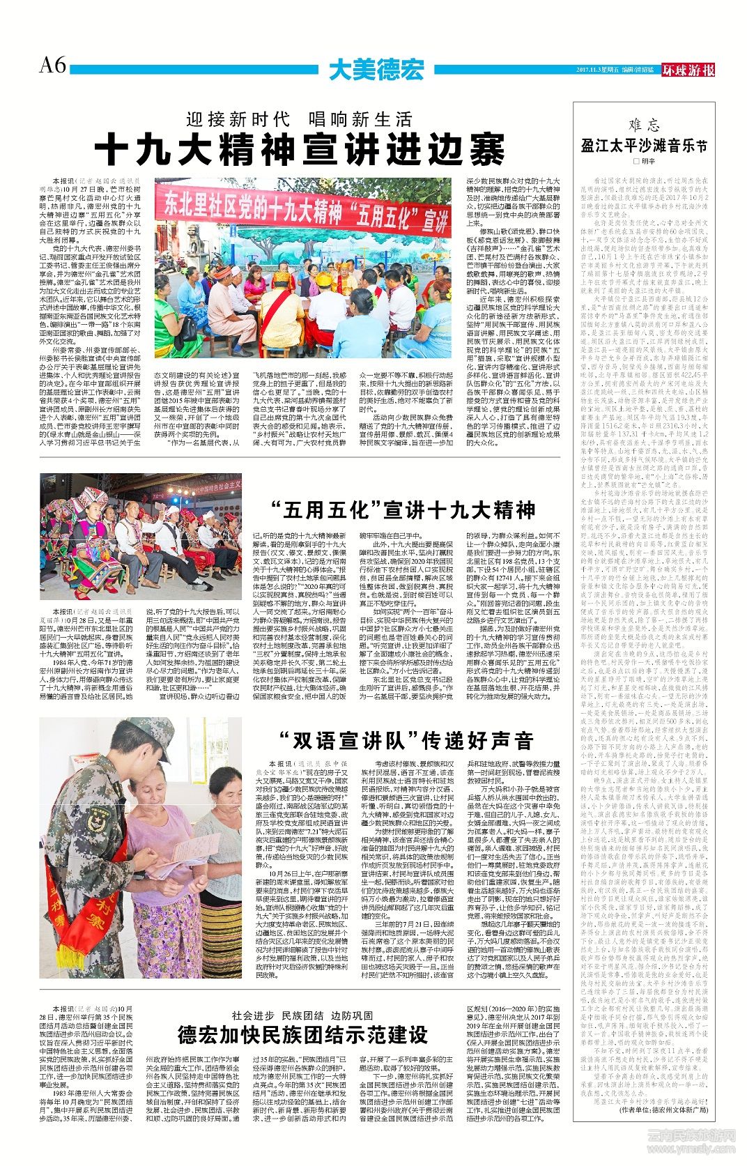 據(jù)悉,為及時做好德宏州黨的十九大精神的學習宣傳貫徹工作,動員全州各族干部群眾迅速掀起學習熱潮,德宏州迅速采用群眾喜聞樂見的“五用五化”形式將黨的十九大精神傳遞到各族群眾心中,讓黨的科學理論在基層落地生根、開花結果,并轉化為推動發(fā)展的強大動力。記者 趙國云 通訊員 夏麗萍 (文章來源環(huán)球游報2017年11月3日第1115期 A6版)