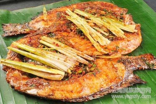 將蔥、姜、蒜、青辣椒、芫荽等佐料切細,放進魚肚子里,用二三根香茅草葉捆好,用竹片夾緊,放在火炭上烘烤,具有香、酥、鮮的特點,是地道的傣家美食。