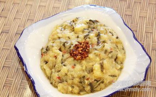 老奶洋芋相信很多人都吃過,但用水淹菜作調(diào)料是傣味吃法。酸菜的爽口遇上洋芋的軟綿,二者融合得恰到好處,中間再點綴上油辣椒、香蔥,胃口頓時大開。