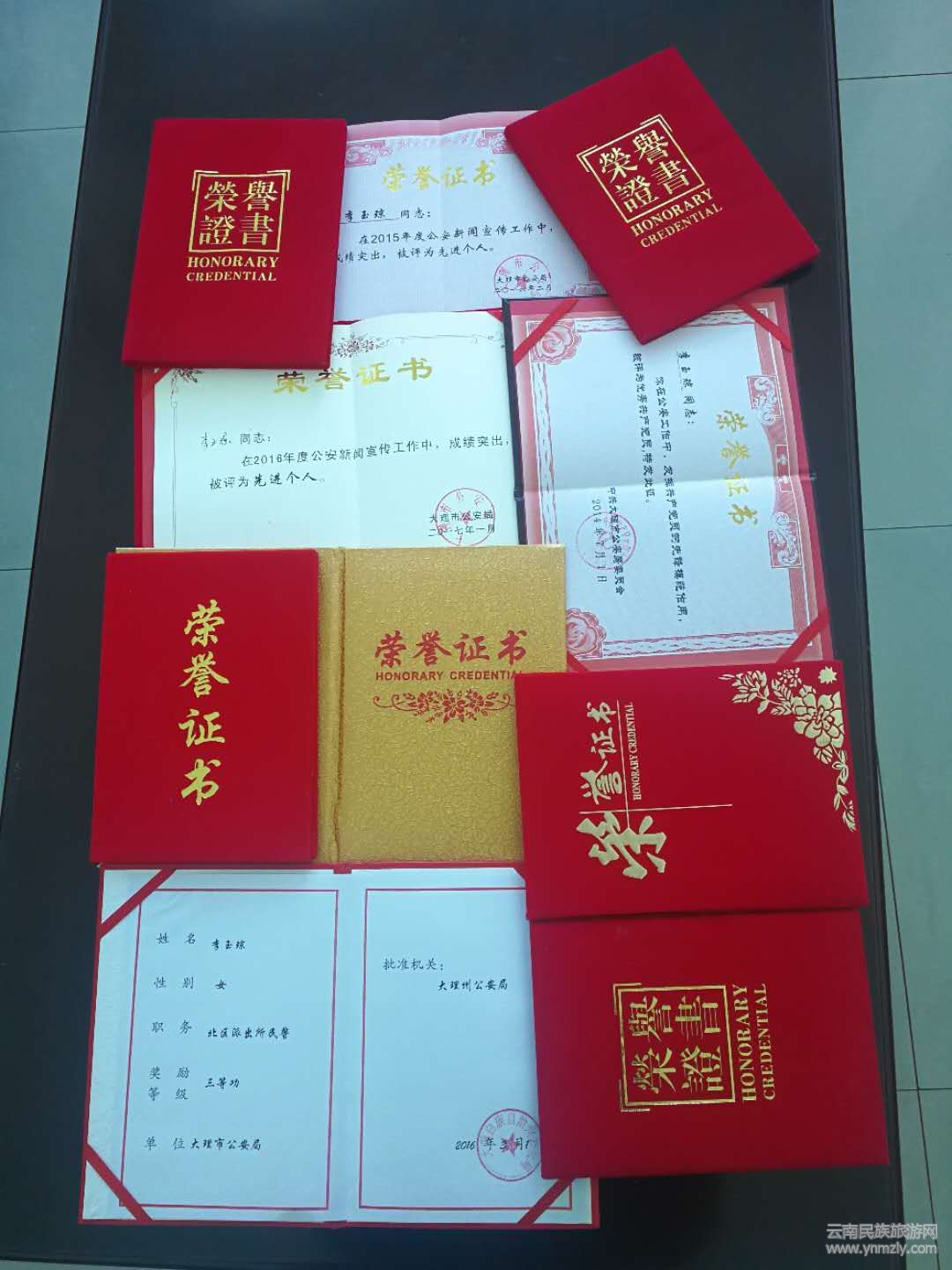 2014年、2015年、2016年連續(xù)三年她被大理市公安局評為優(yōu)秀宣傳民警;2014年、2015年、2016年連續(xù)三年被評為優(yōu)秀公務(wù)員;她所在的北區(qū)派出所也連續(xù)三年(2014年、2015年、2016年)被大理市公安局評為宣傳工作先進(jìn)集體。