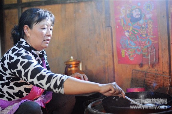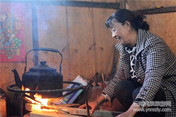 火塘中的柴火燒得正旺,鐵三腳上的壺嘴里不斷冒著熱氣,豐紹珍將小鍋端上來,放上酥油和漆油開始翻炒。