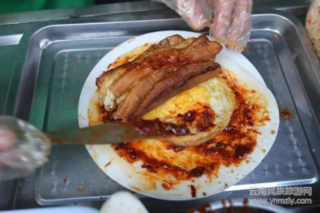 在古代,麥類制作的食物統(tǒng)稱為“餅”,米類制作的稱為“餌”,作為稻米之鄉(xiāng)的云南,不負眾望將米類吃食制作的爐火純青,餌塊便是除了米線之外的另一特色。燒餌塊和天津的煎餅果子類似,區(qū)別在于燒餌塊的餅皮是用煮熟的大米壓制成餅狀,并在無煙炭火上烤至金黃,加入老油條、雞蛋等,再涂上不同口味的醬料。食在昆明,每天叫醒你的不是夢想,而是熱乎乎的燒餌塊。