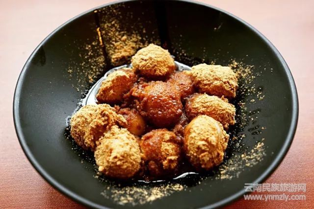 與過元宵節(jié)吃的晶瑩剔透的湯圓不同,豆面湯圓最大的特色就是表層的熟黃豆面,細膩糍糯的湯圓裹上滿滿的黃豆香味,再澆上熬得濃香的紅糖水,這道香甜的小吃是無數(shù)老昆明人的最愛。傳統(tǒng)的豆面湯圓是不包餡兒的,并須以上好的糯米和秈米混合成漿,濾掉水分形成吊漿面。如今豆面湯圓中也加入了花生、芝麻、紅豆等餡兒料,口感絕對不輸其他省份的同類小吃競品。