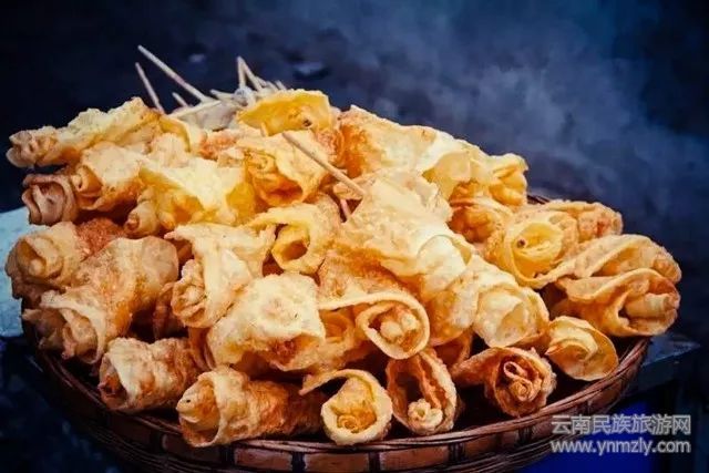 云南十八怪之“牛奶做成片片賣”,講的就是這乳扇,它是一種薄片狀的特質(zhì)干酪,因形狀如菱角狀竹扇之形而得名。烤制的乳扇通常會加入玫瑰醬、蜂蜜等調(diào)味,濃郁的奶香與花香在口中酸甜回旋,一定要趁熱吃才能感受到奶皮的香酥口感。