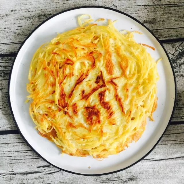 在云南,大部分地形為山坡或山地,造就了馬鈴薯的天然生長環(huán)境。土豆有個洋氣的學(xué)名叫洋芋,作為云南僅次于水稻、玉米的第三大糧食作物,充分發(fā)揮了它的百變屬性。云南人充分利用這一點將其蒸、炸、煎、煮、燒創(chuàng)造出洋芋粑粑、炸洋芋、老奶洋芋、拌洋芋等吃食。土豆絲雞蛋餅是將切好的土豆絲放入鍋中干煎,最后加入蛋液形成沒有面粉的土豆絲餅,方便又美味。