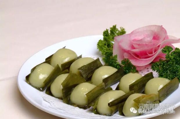 葉兒粑,制作葉兒粑選料考究,工藝精細,具有色綠形美、細軟爽口的特點,為四川傳統(tǒng)名小吃之一。用糯米粉面包麻茸甜餡心或鮮肉咸餡心,置旺火蒸。特色是清香滋潤,醇甜爽口,荷香味濃,菜分兩味,咸鮮味美。