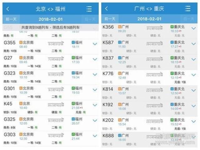 ↑記者通過(guò)12306客戶端瀏覽余票,北京至福州余票較多,廣州至重慶則已基本售罄。