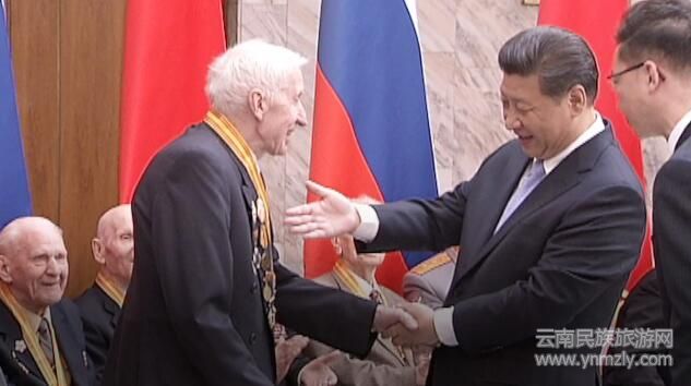 Xi awarded medals to Russian veterans for their contributions to China’s victory against Japanese aggression and the World Anti-Fascist War. Many of the veterans attending the event had limited mobility, so Xi brought the medals over to them.