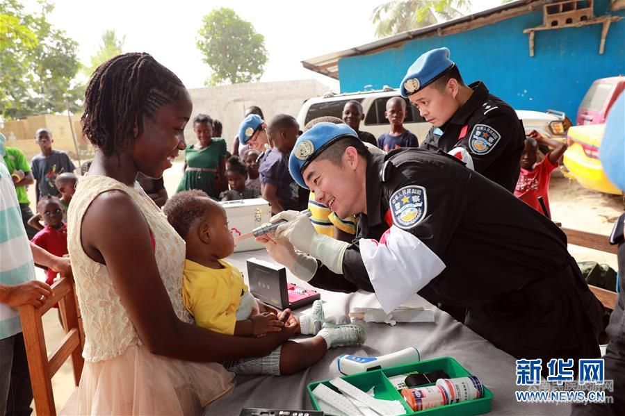 2017年12月28日,在利比里亞蒙羅維亞,中國(guó)維和警察防暴隊(duì)醫(yī)療人員為兒童做口腔檢查。當(dāng)日,中國(guó)第五支駐利比里亞維和警察防暴隊(duì)派出醫(yī)護(hù)人員前往蒙羅維亞市本森威爾社區(qū)孤兒院,為兒童和員工進(jìn)行義診。新華社發(fā)(趙小新攝)