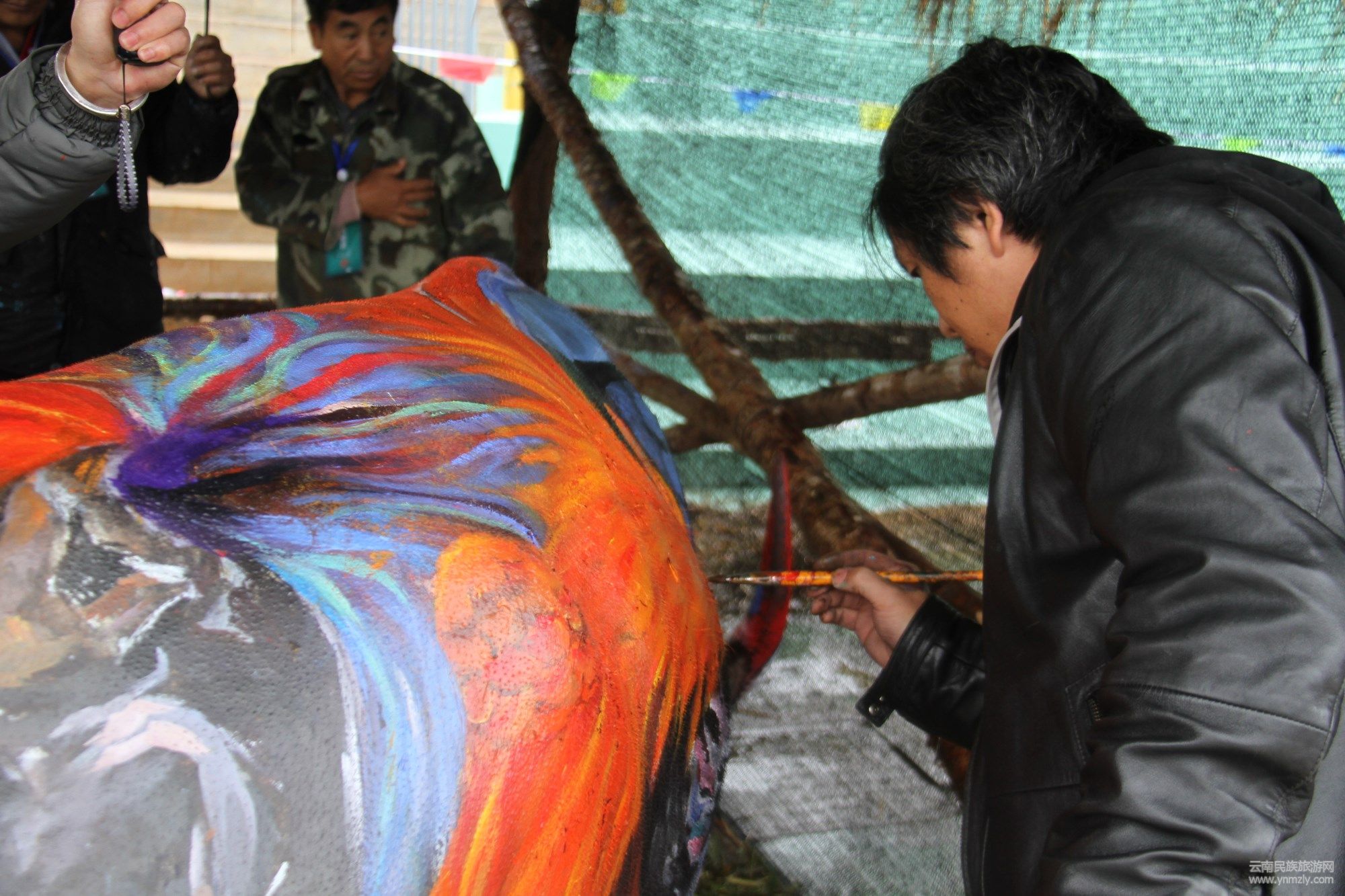 比賽之前,參賽隊(duì)們提前給牛洗好了澡,剃了牛毛,準(zhǔn)備在比賽時(shí)大顯身手。各參賽繪畫師們專心致志、一絲不茍著揮動(dòng)著手中的畫筆,懷著對(duì)藝術(shù)的無限追求,盡情揮灑,在牛的身上描繪出一幅幅活靈活現(xiàn)的圖案。賽場(chǎng)上,一條條色彩斑斕的火牛昂首挺胸地走動(dòng)著,向人們展示著大豐收、美麗中國夢(mèng)、祥和的邊城等在黨的領(lǐng)導(dǎo)和各族人民的共同努力下所取得的豐碩成果。