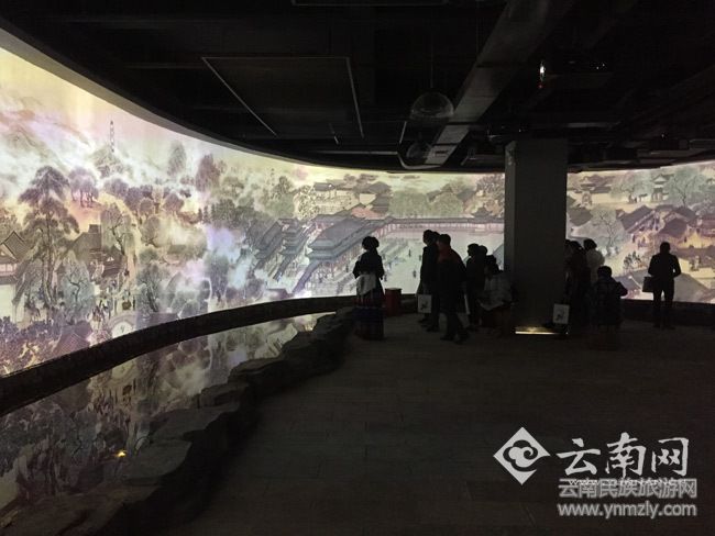 有場(chǎng)館“鎮(zhèn)館之寶”之稱的動(dòng)態(tài)畫卷《納西風(fēng)情圖》,全長(zhǎng)100米,高3米。據(jù)介紹,該畫卷創(chuàng)作前后歷時(shí)3年,共有百余位人員參與創(chuàng)作,是國(guó)內(nèi)首個(gè)百米動(dòng)態(tài)民俗風(fēng)情長(zhǎng)卷。畫卷以“茶馬古道”為主線,由“雪山秘境、桃源白沙、茶馬束河、署古黑龍?zhí)丁⒍κ⒋笱小⑽《肽靖⒋竺览?rdquo;等7大模塊構(gòu)成,重現(xiàn)了明朝時(shí)期麗江市井的繁榮。