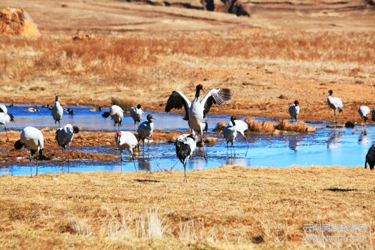 大寶山更是世界瀕危珍稀物種黑頸鶴的溫馨家園。在跳墩河水庫、大海子水庫兩個地方可看到成群結(jié)隊(duì)的黑頸鶴在湖邊覓食、棲息,碩大的羽翼展翅于碧海藍(lán)天間,傲然飛翔。