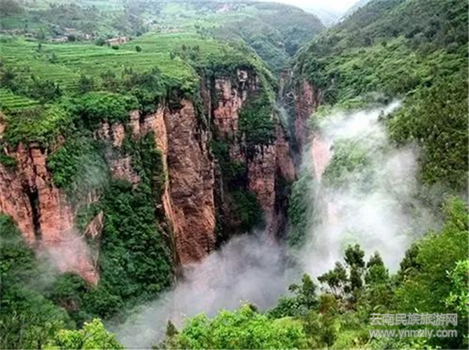 環(huán)看四周峭壁,真的像被刀削過(guò)一樣。絕壁上一道瀑布從谷頂順流而下流入谷底深處,雖然隱約能聽(tīng)到河在腳下的流水聲,但我們卻看不到河水,真是神秘莫測(cè)。瀑布沖刷在絕壁上濺起的水,被微風(fēng)吹散在空氣中形成了細(xì)小的水珠,這就是剛剛帶來(lái)涼爽的源頭。