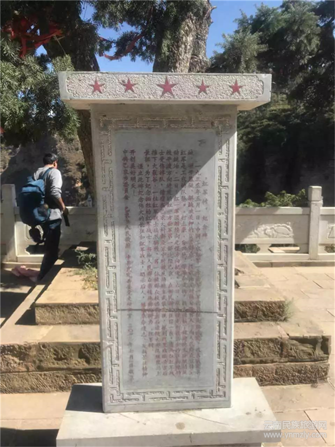 1935年,紅軍長(zhǎng)征過(guò)武定,部分紅軍戰(zhàn)士從己衣路過(guò)趕往皎平渡渡江。有兩名紅軍戰(zhàn)士因身患疾病無(wú)法行走,就借住在老鄉(xiāng)家養(yǎng)病。紅軍大部隊(duì)走后,當(dāng)?shù)赝练司硗林貋?lái),強(qiáng)行抓走兩名紅軍戰(zhàn)士,并從這里將他們推下萬(wàn)丈深淵,殘忍地殺害了紅軍戰(zhàn)士,至今尸骨都未找到。為了紀(jì)念這些為窮苦人民打天下的紅軍戰(zhàn)士,這里的群眾就把這棵樹(shù)叫做“紅軍樹(shù)”。