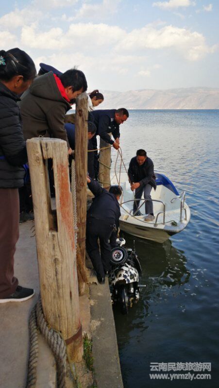 近日,一游客騎電瓶車在洱海游邊玩時(shí),電瓶車不慎掉入洱海,報(bào)警后民警及時(shí)相助,將電瓶車從洱海打撈上岸。