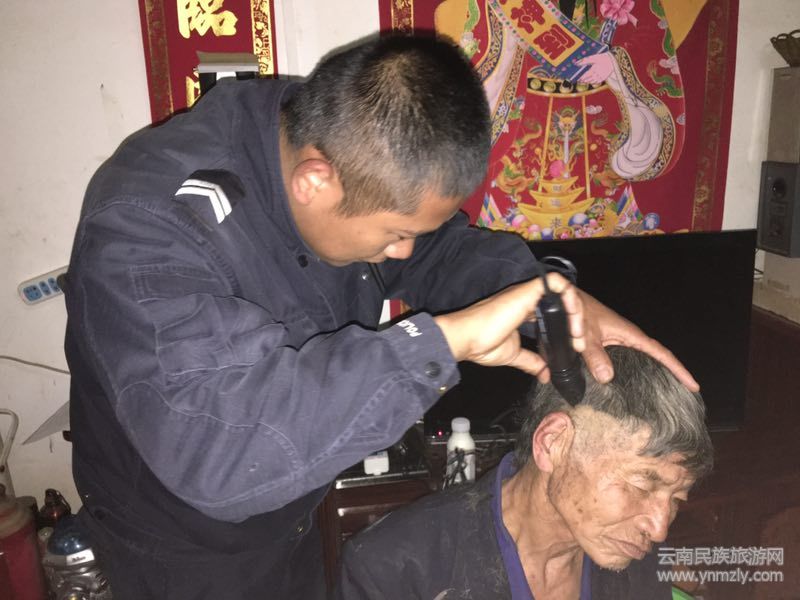 左手梳子,右手推剪。輔警小哥哥操持這些理發(fā)工具還真是象模象樣。2017年11月23日晚,南華縣公安局兔街派出所的輔警在對轄區(qū)黃草嶺小組進(jìn)行“一標(biāo)三實(shí)”入戶采集時(shí),了解到一名寥姓居民身份證到期,因身患?xì)埣矡o法前往派出所辦理,輔警小哥哥隨即找來理發(fā)用的工具,為其修剪頭發(fā)并拍攝辦證照片。