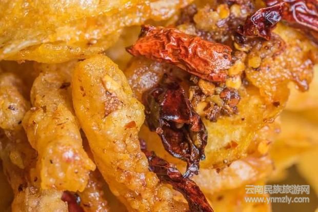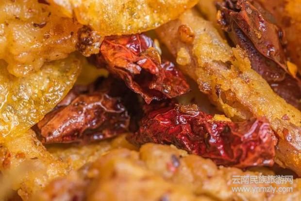 由于加入干辣椒和各種配料腌制了很長時(shí)間,又油炸至香脆無比,絕對是下酒菜排行榜第一的菜品。
